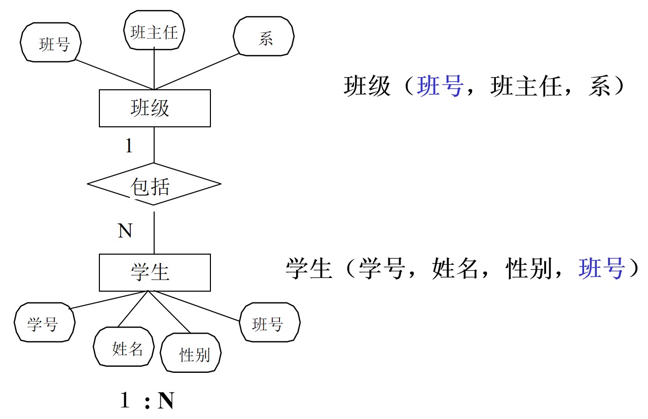 例子:一个班级中有若干名学生、每个学生只在一个班级中学习等。